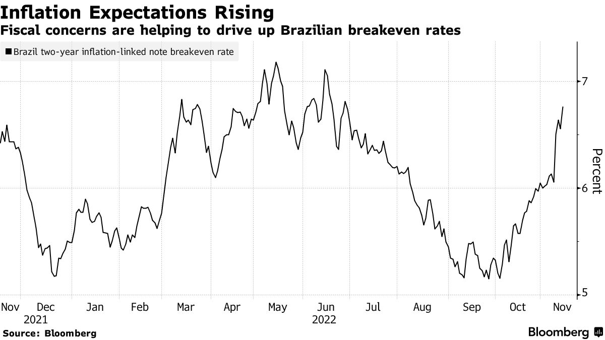 两年期通胀联结票据的所谓盈亏平衡率,即交易员对该时间段内消费者价格涨幅的平均预期,自10月初以来已飙升超过1.6个百分点,达到约6.77%。这段时间包括巴西总统选举的最后阶段,当时越来越明显,卢拉很可能击败现任总统雅伊尔·博尔索纳罗,以及选举后的情况。
