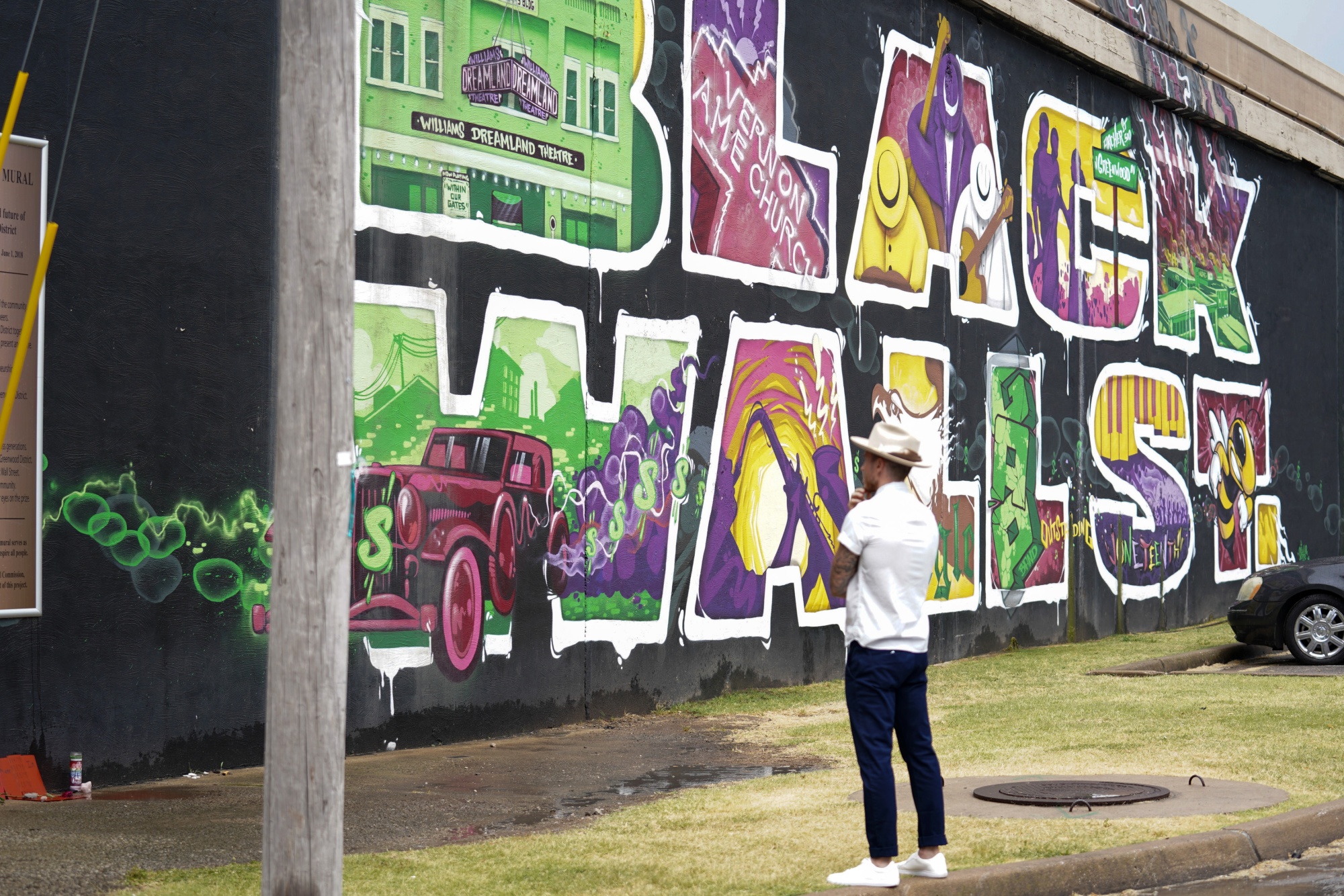 2020年6月19日,一名行人站在俄克拉荷马州塔尔萨格林伍德区的黑人华尔街壁画前。格林伍德曾是美国最繁荣的非裔美国人聚居地之一,直到其居民被屠杀。摄影师:克里斯托弗·克里斯/彭博社所罗门-西蒙斯和来自律所Schulte Roth & Zabel的律师团队在上个月向俄克拉荷马地方法院法官卡罗琳·沃尔面前陈述了他们的案件后,必须在11月18日之前对城市最新的驳回请求提出回应。他们代表108岁的莱西·本宁菲尔德“母亲”兰德尔、107岁的维奥拉“母亲”弗莱彻和101岁的休斯·范埃利斯提起诉讼。