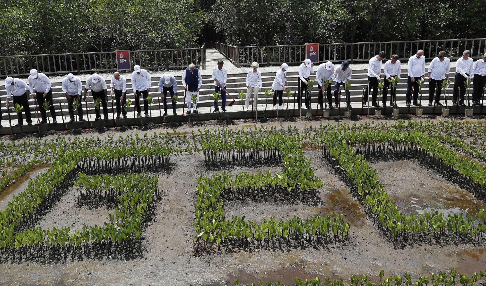 领导人在11月16日巴厘岛举行的二十国集团峰会期间参加了一场植树活动。