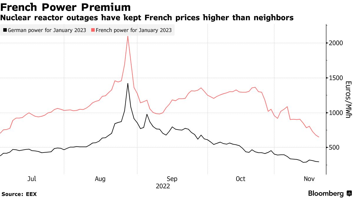 今年几乎一半的法国电力公司的核电站正在进行维修和保养,这使得这个传统上是电力出口国的国家成为了进口国。担心的电力危机,加上俄罗斯对欧洲的天然气供应削减,已经导致整个欧洲能源价格飙升。