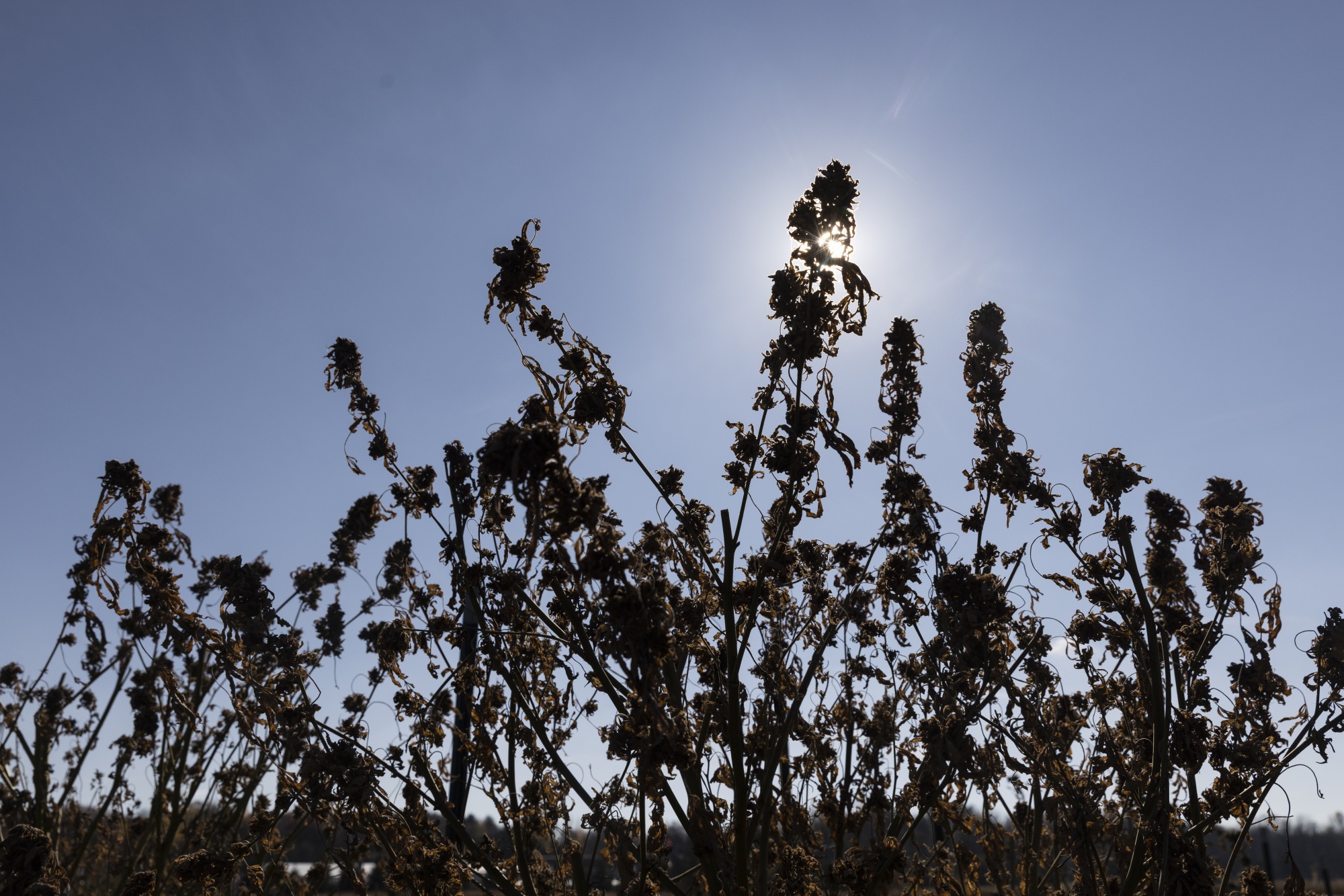 大麻植物的干燥残留物仍然留在纽约哈德森的大麻农场的田地里,拍摄于2022年11月2日。