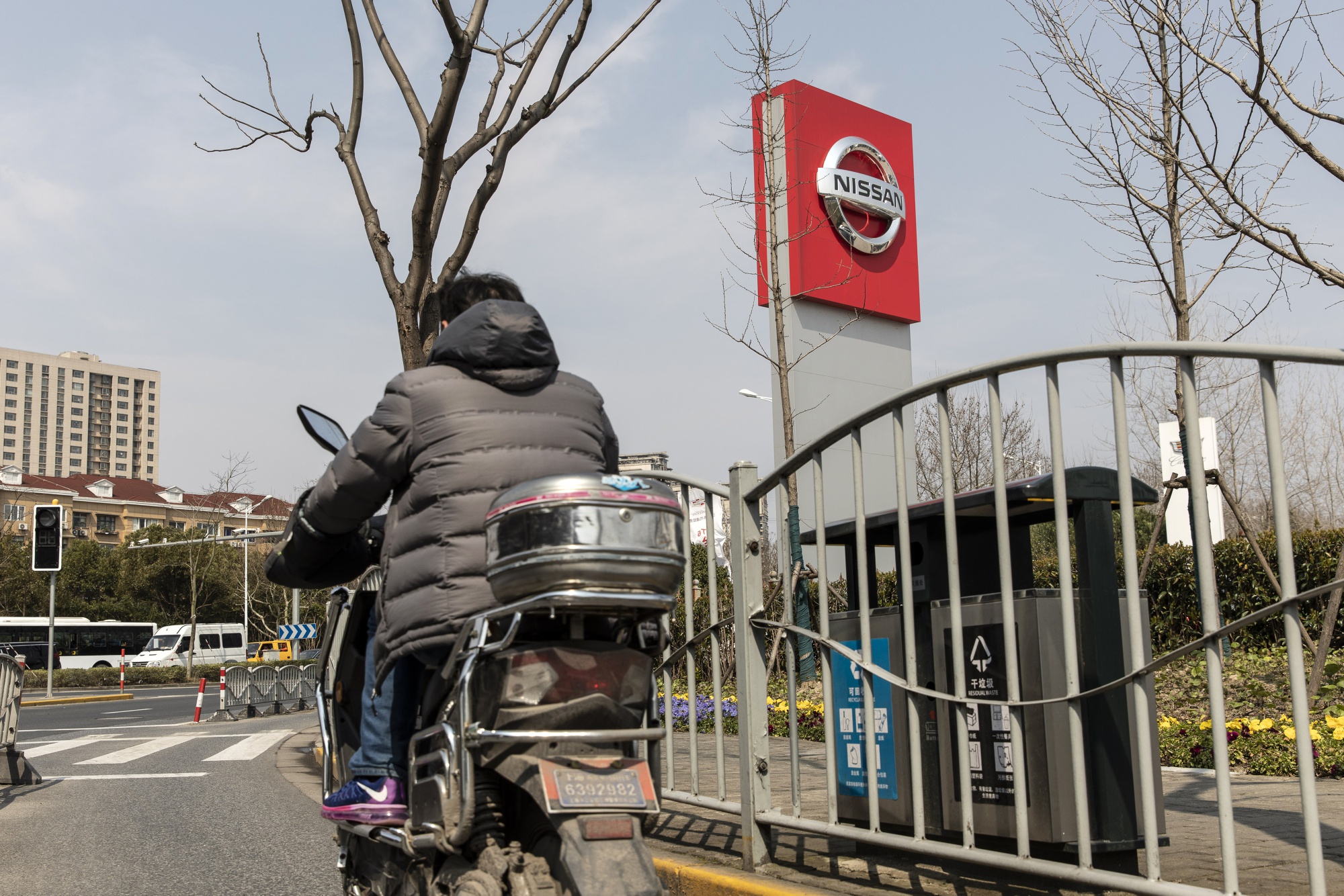 一名摩托车手驶过位于中国上海的一家汽车经销商展示的日产汽车标牌。
