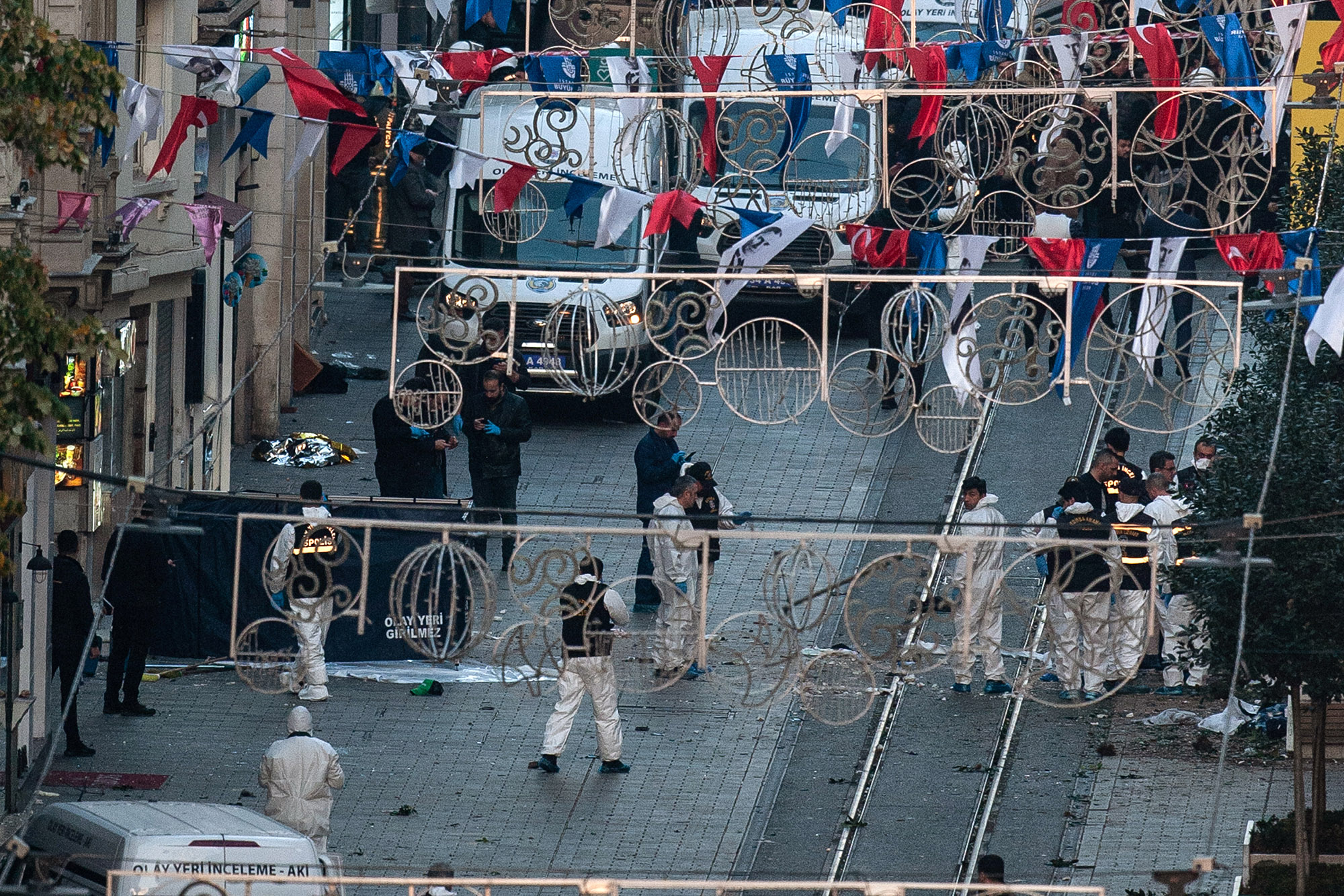 紧急人员在11月13日的伊斯坦布尔伊斯蒂克拉尔大街爆炸事件发生后调查现场。