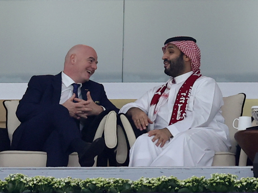 沙特阿拉伯王储穆罕默德·本·萨勒曼坐在谢赫塔米姆旁边两个座位,与国际足联主席贾尼·因凡蒂诺进行讨论。据媒体报道,这个王国正在考虑申办2030年世界杯。考虑申办2030年世界杯。