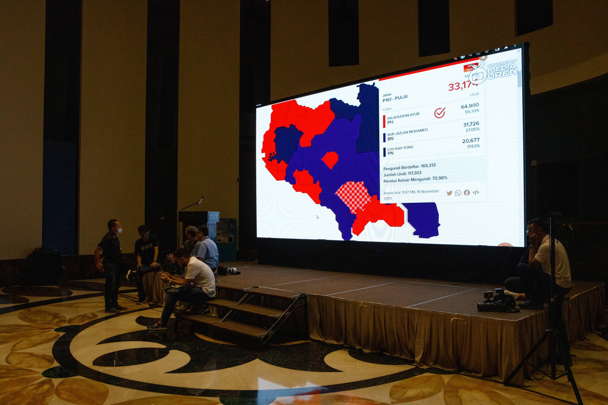 媒体成员在11月20日的选举活动中观看投票结果,该活动在帕卡坦哈拉潘阵营举行。