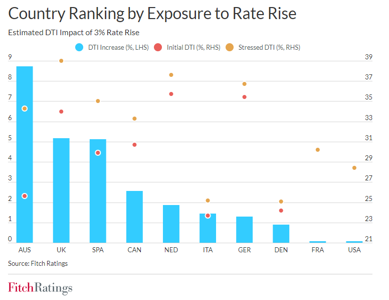 五月份,惠誉评级机构查看了因为浮动利率贷款和巨额债务而最容易受到利率上升影响的国家。他们将澳大利亚、英国、西班牙和加拿大列为风险最高的国家。