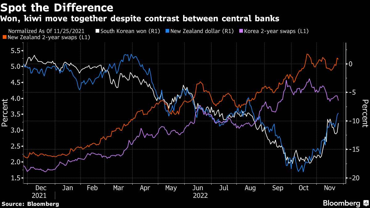 本周为亚洲的两家央行带来了不同的故事,但在货币方面,每家的最终结果看起来相当相似。韩国央行周四仅提高了一个季度点的利率,并明确表示,对于它来说,超大规模加息的时代已经结束。就在这一天之前,新西兰储备银行全面转向鹰派 —— 将其基准利率提高了四分之三个百分点,并提高了其利率预测。