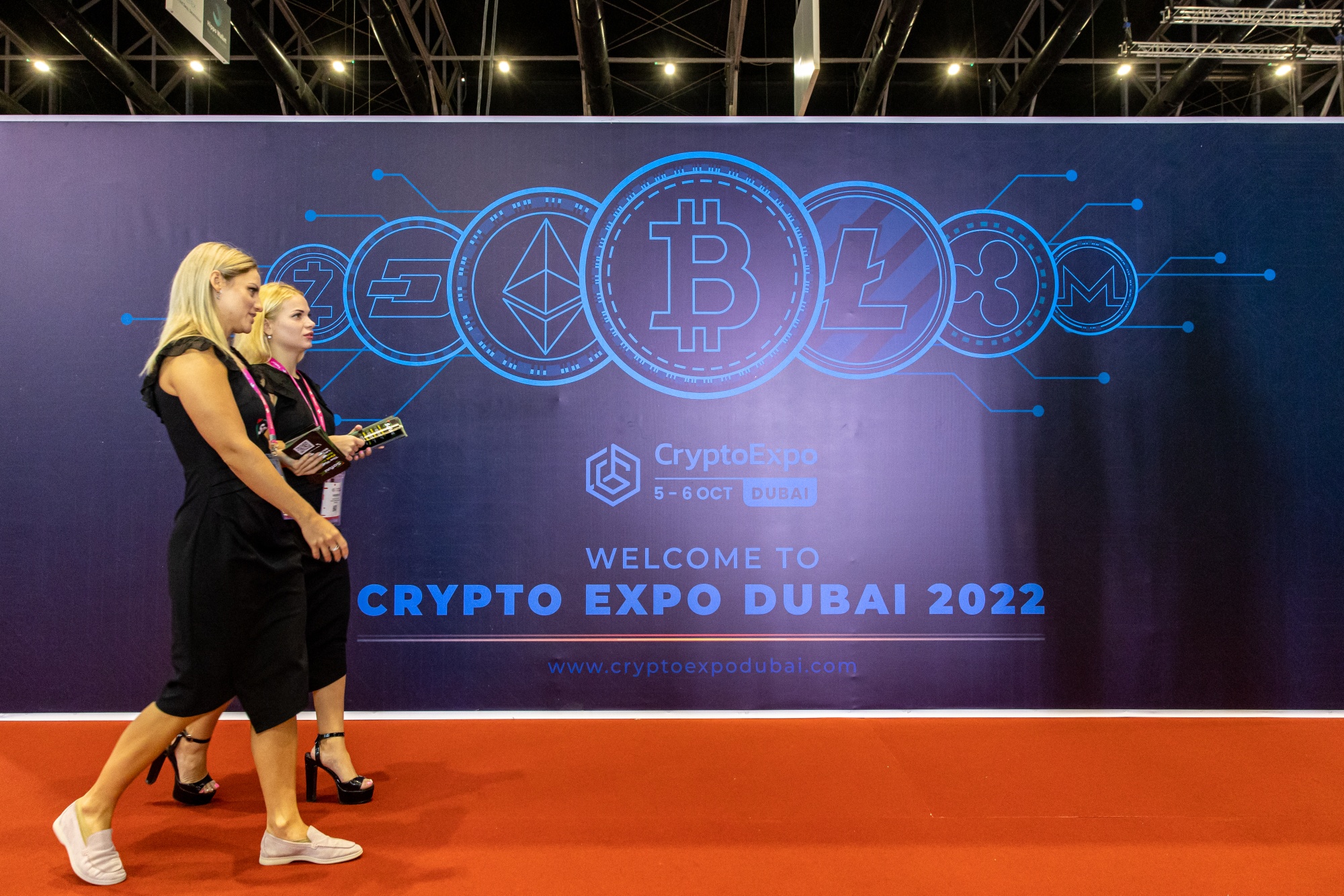 在迪拜加密货币博览会期间,活动牌上展示着加密货币的标志。摄影师:Christopher Pike/Bloomberg