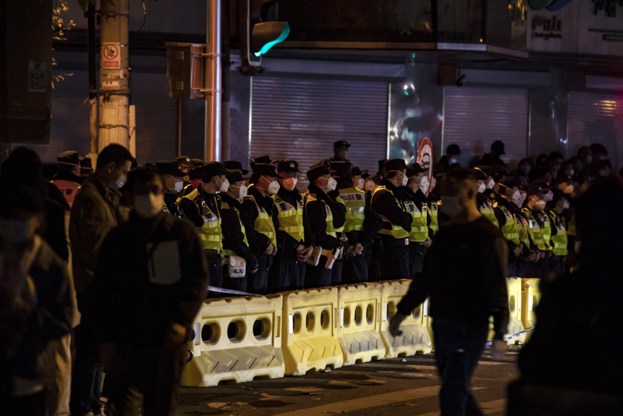 警察在上海的抗议活动中站岗,中国,周日。