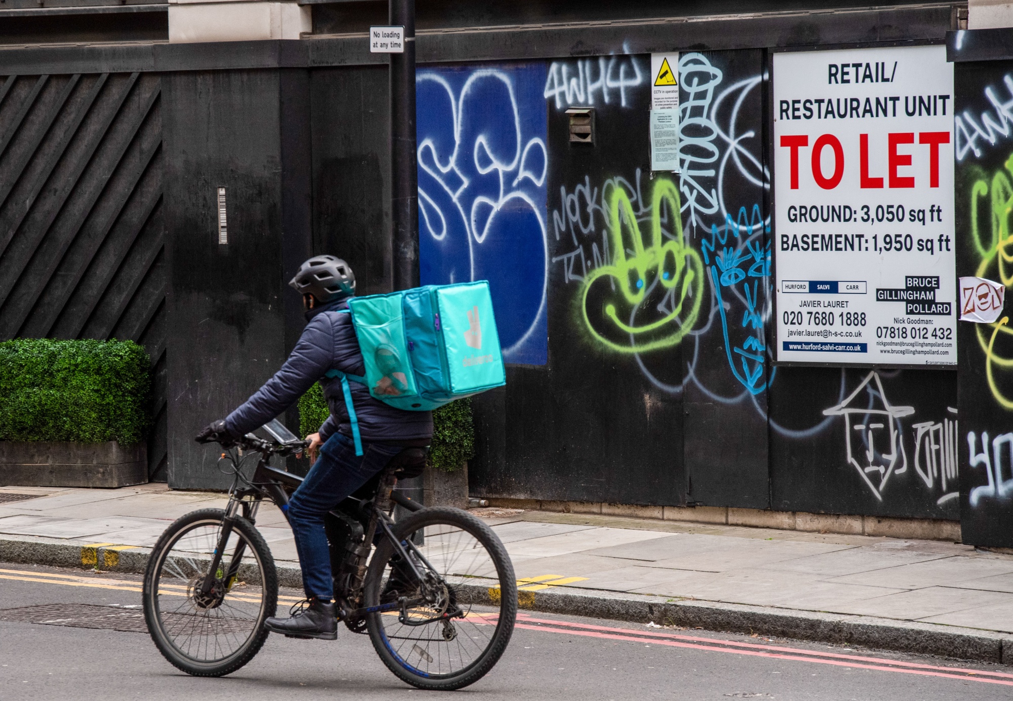 一名Deliveroo Plc食品快递员经过伦敦Petticoat Lane市场附近一家空置零售单位外的“待租”标志,拍摄于11月11日星期五。