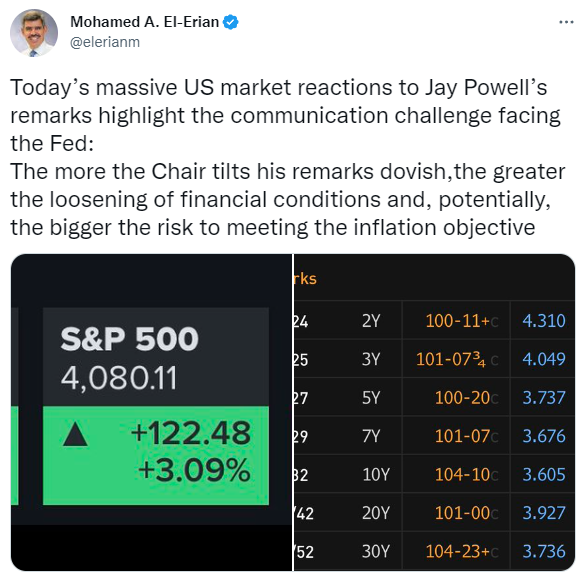 “他的主要目标是传达2023年不会放松的信息,这一信号已经传达到了,”他说。“市场受到鼓舞,因为长期持有策略意味着不会再加息太多。”