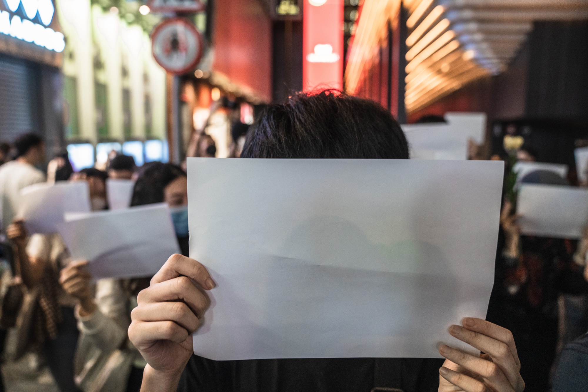 示威者在香港举行的悼念中国“零Covid政策”受害者的烛光守夜中举着空白抗议标语,时间为2022年11月28日星期一。