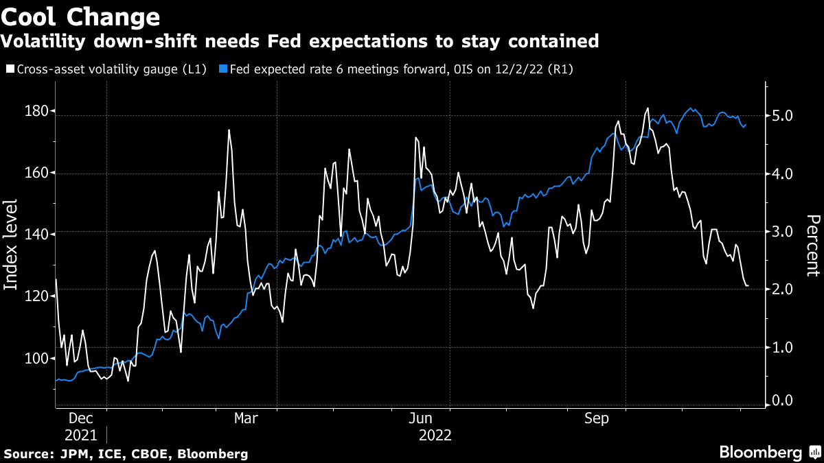 然而,截至当天结束时,美国收益率除了短端外都有所下降,即使在短端,两年期利率也仅上涨了四个基点,而标普500指数仅下跌了0.1%。波动率指标下降,延续了我喜欢用来跟踪货币、股票和债券市场焦虑水平的跨资产指数的下滑趋势。关键仍然是美联储以及它将如何做出反应,市场看起来相信即使是最新的就业报告也不会使央行偏离预期的放缓路径,即12月半点加息。只要交易员们相信终端利率将低于5% —— 意味着在本月之后还会有不到1个百分点的加息 —— 市场可能会变得更加平静。