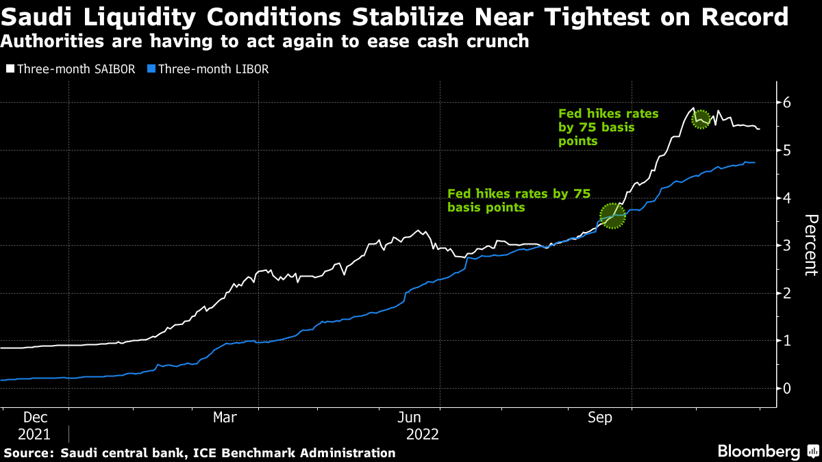 沙特阿拉伯央行已经 加大了 一种向金融系统注入资金的机制的使用,以应对导致借贷成本飙升至数十年来最高水平的流动性危机。央行SAMA的努力有助于稳定银行间贷款利率,尽管它仍然接近创纪录的高位。