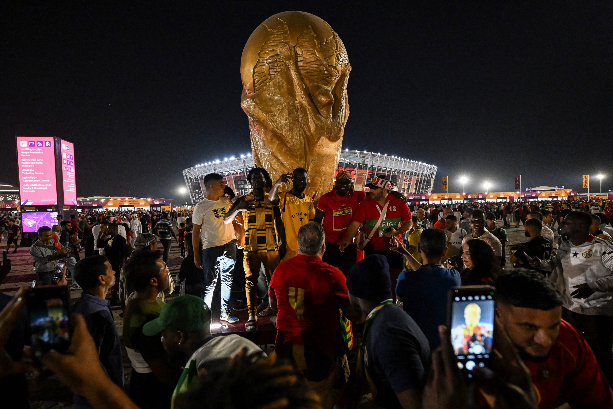 加纳和葡萄牙足球迷聚集在多哈974体育场外。摄影师:NATALIA KOLESNIKOVA/AFP
