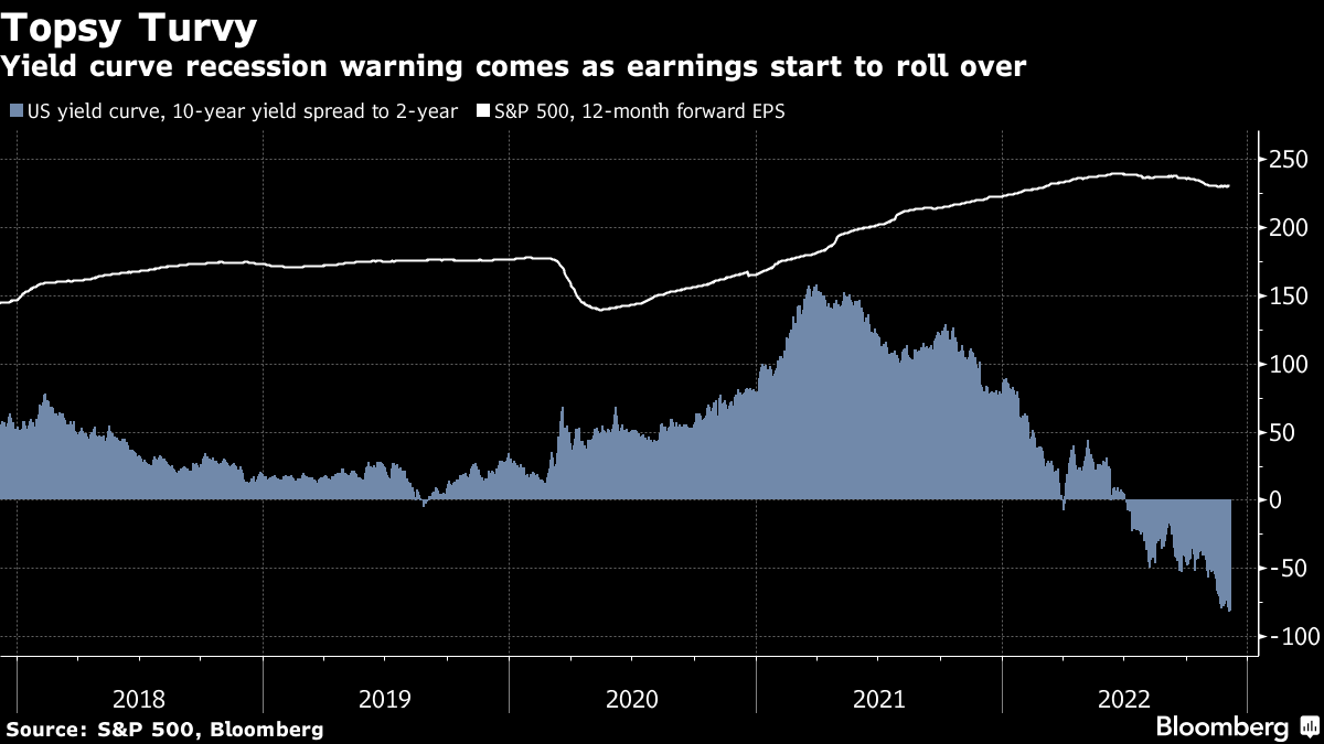 与此同时,收益曲线继续崩溃,呈现出越来越陡峭的倒挂,表明在中期内增长最多也只能是疲弱的。如果债券市场的赌注准确的话,盈利预期的下降也可能会大幅走低,并将股价一同拖下。