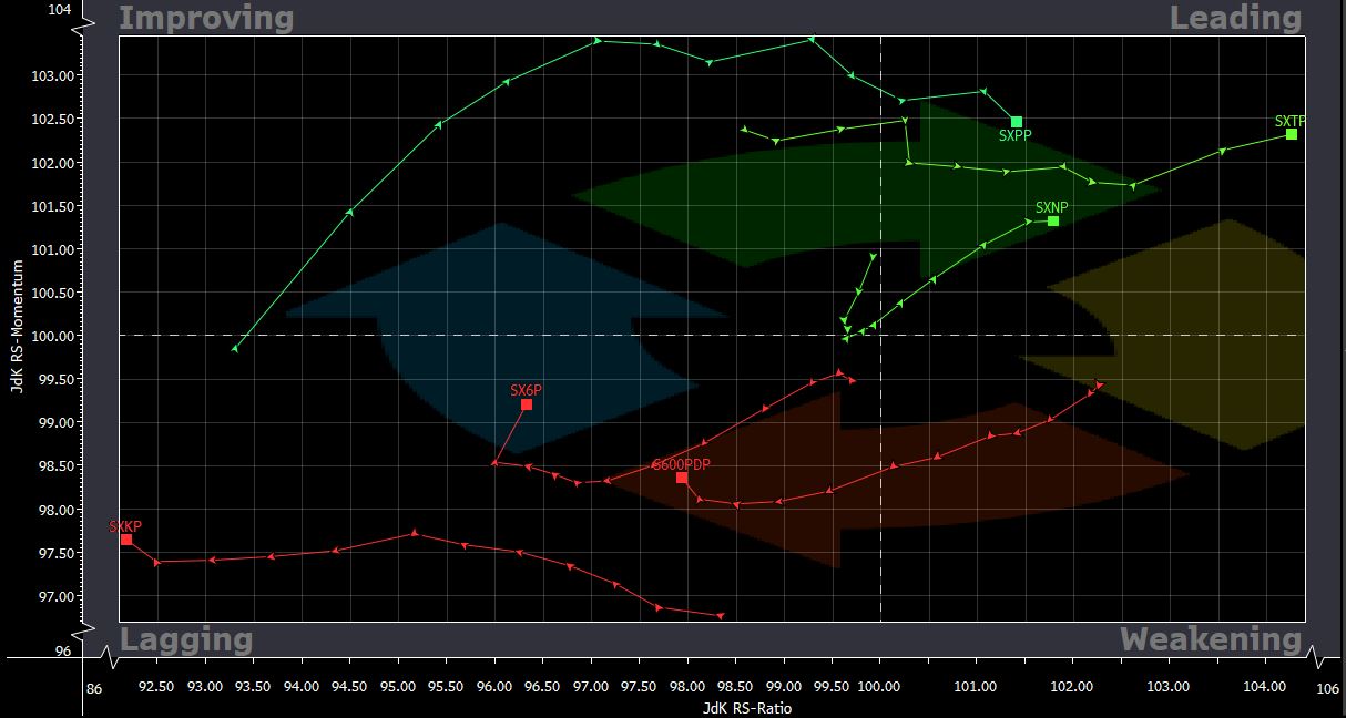 根据相对旋转研究,过去12周,领先的行业包括矿业、工业品和服务以及旅行公司,该研究衡量股价走势的动量以评估投资者偏好的变化。