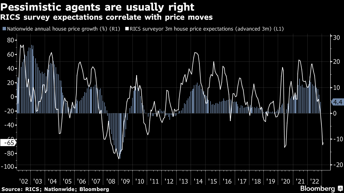 条形图显示了房价的年度变化(根据Nationwide的数据),而折线显示了RICS成员对未来三个月房价的预期,但提前了三个月(例如,今天的数据已提前到2023年2月)。就方向而言,这是一个相当不错的拟合,这意味着房价还有下跌的空间。