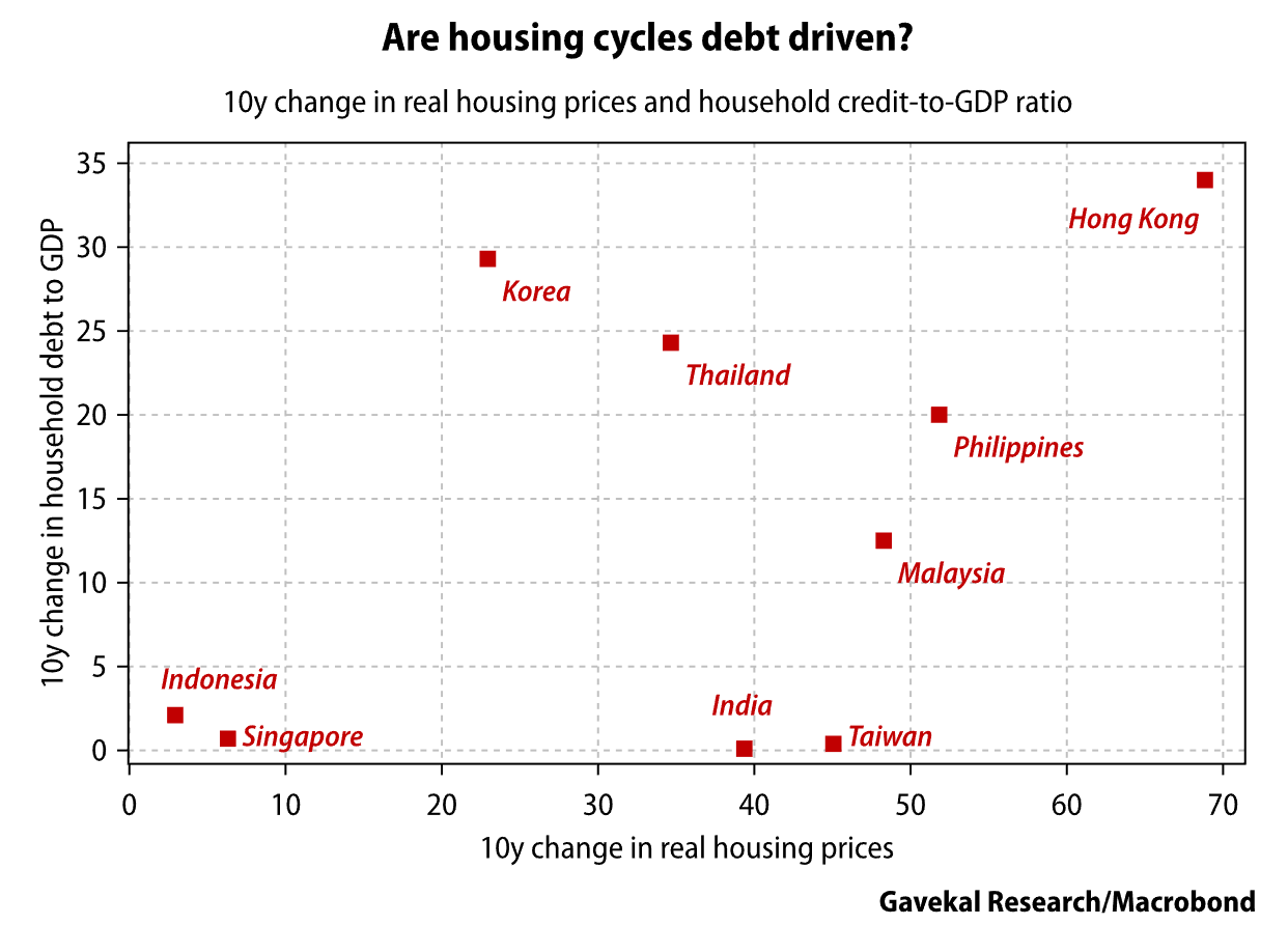 香港、马来西亚和菲律宾被认为是最容易受到房地产调整影响的国家,而台湾则是一个积极的离群值,Gavekal的Vincent Tsui在本周的一份报告中写道,央行“保持了杠杆比率低,使投机活动难以融资”。