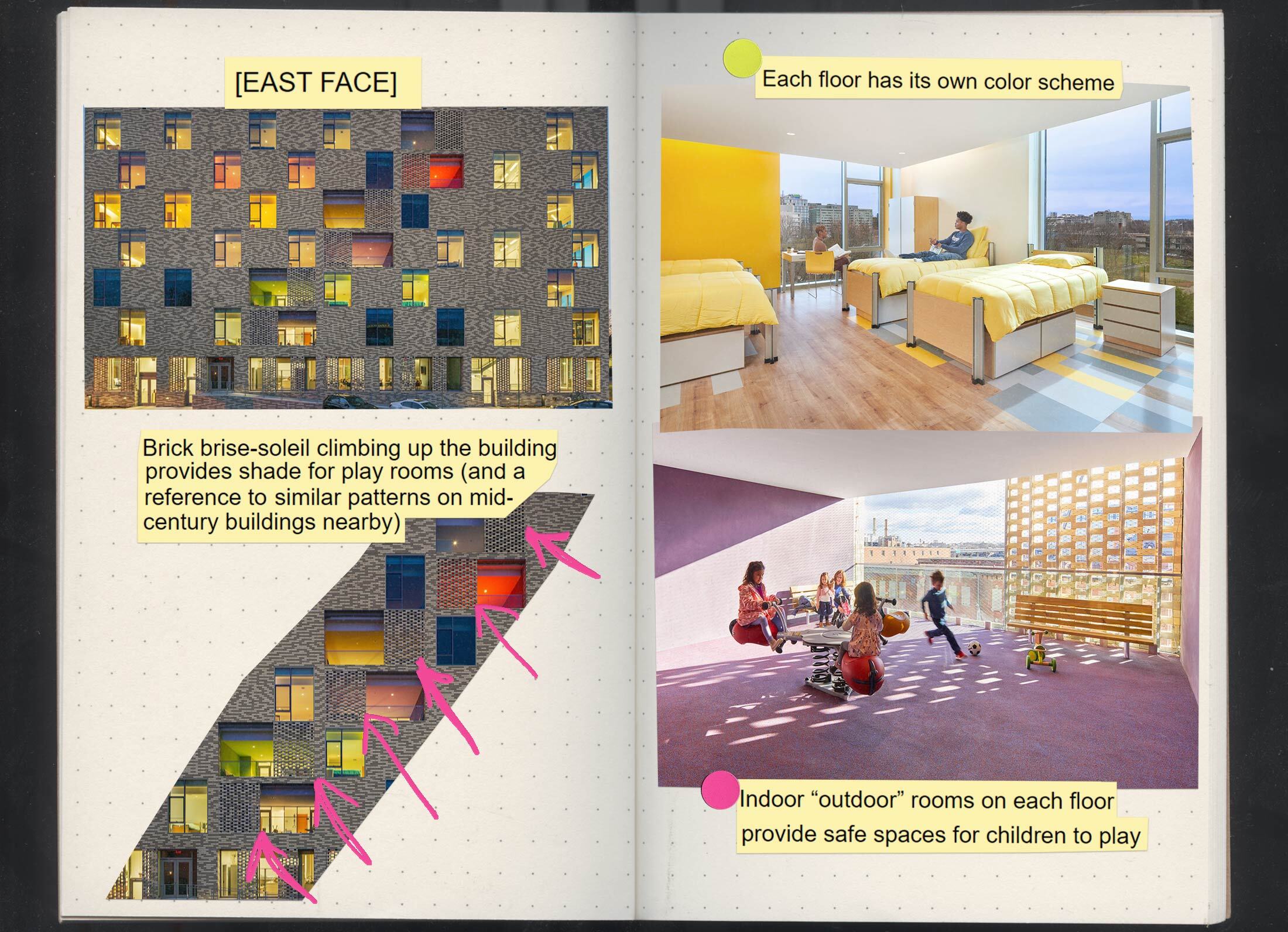 照片由Studio Twenty Seven Architecture提供。插图:Stephanie Davidson留在庇护所的家庭非常年轻:那里的儿童平均年龄为3岁。因此,城市要求提供安全的游乐空间。Studio Twenty Seven设计了一系列室内户外风格的游乐室,这些房间呈楼梯状向建筑物上升。沿着这些房间的砖砌遮阳板为建筑物中发现的建筑纹理提供了一种有趣的镜像邻里中世纪公寓建筑。