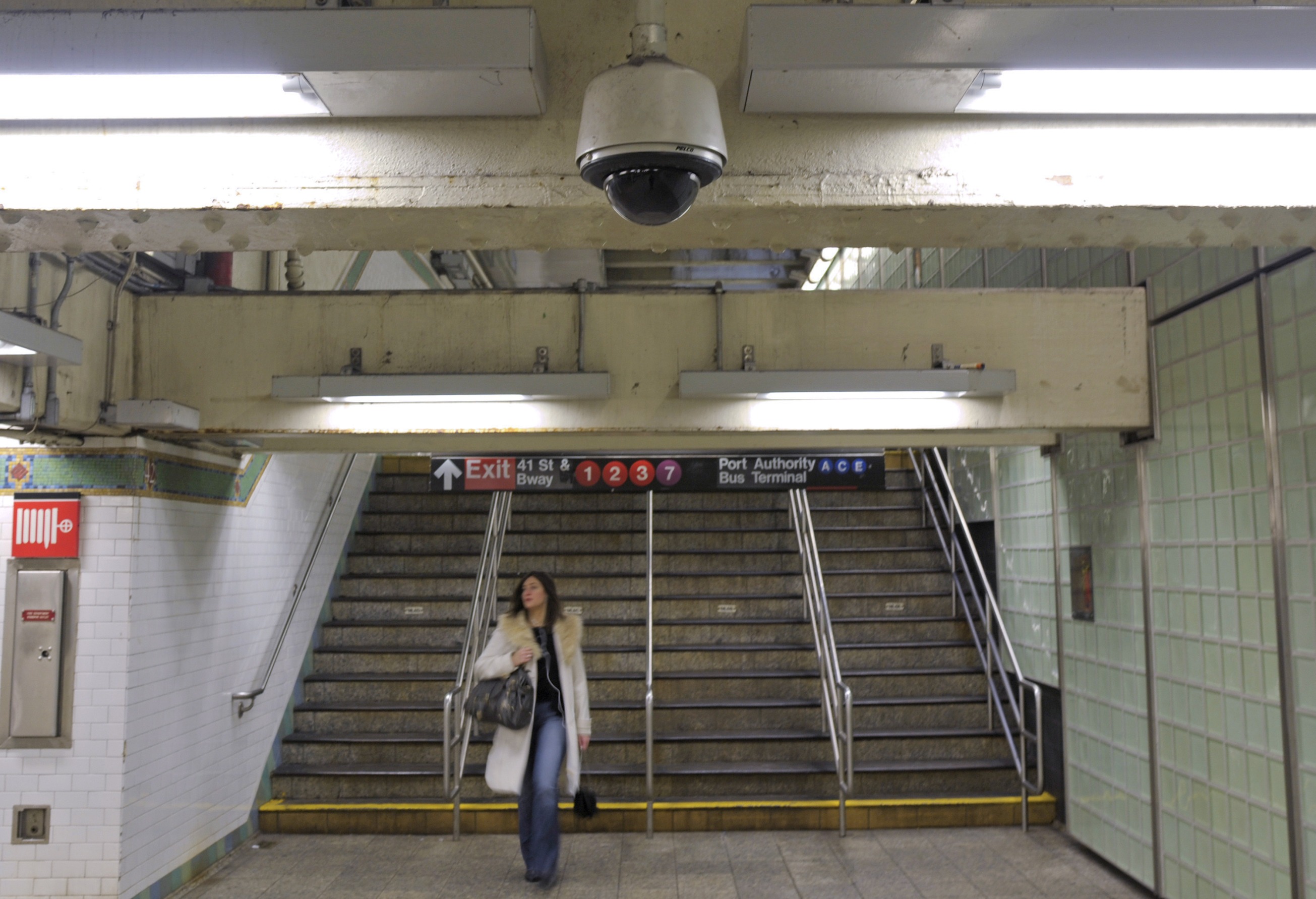 纽约地铁乘客经过一台安全摄像头。