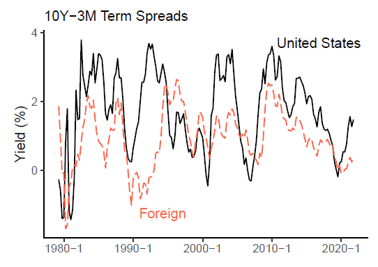 来源:拉沙德·艾哈迈德和门齐·钦这对组合使用日本、德国、英国和加拿大债券计算了一个平均收益率曲线,或“期限利差”。他们发现,随着时间的推移,这些市场的变化与美国有所不同。而海外期限利差传达了两条有趣的信息。