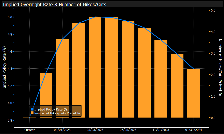 联邦基金期货市场也显示2023年的利率将上升。但是在五月之后,债券市场衍生品暗示联邦储备委员会将在2023年结束前开始降息半个百分点。