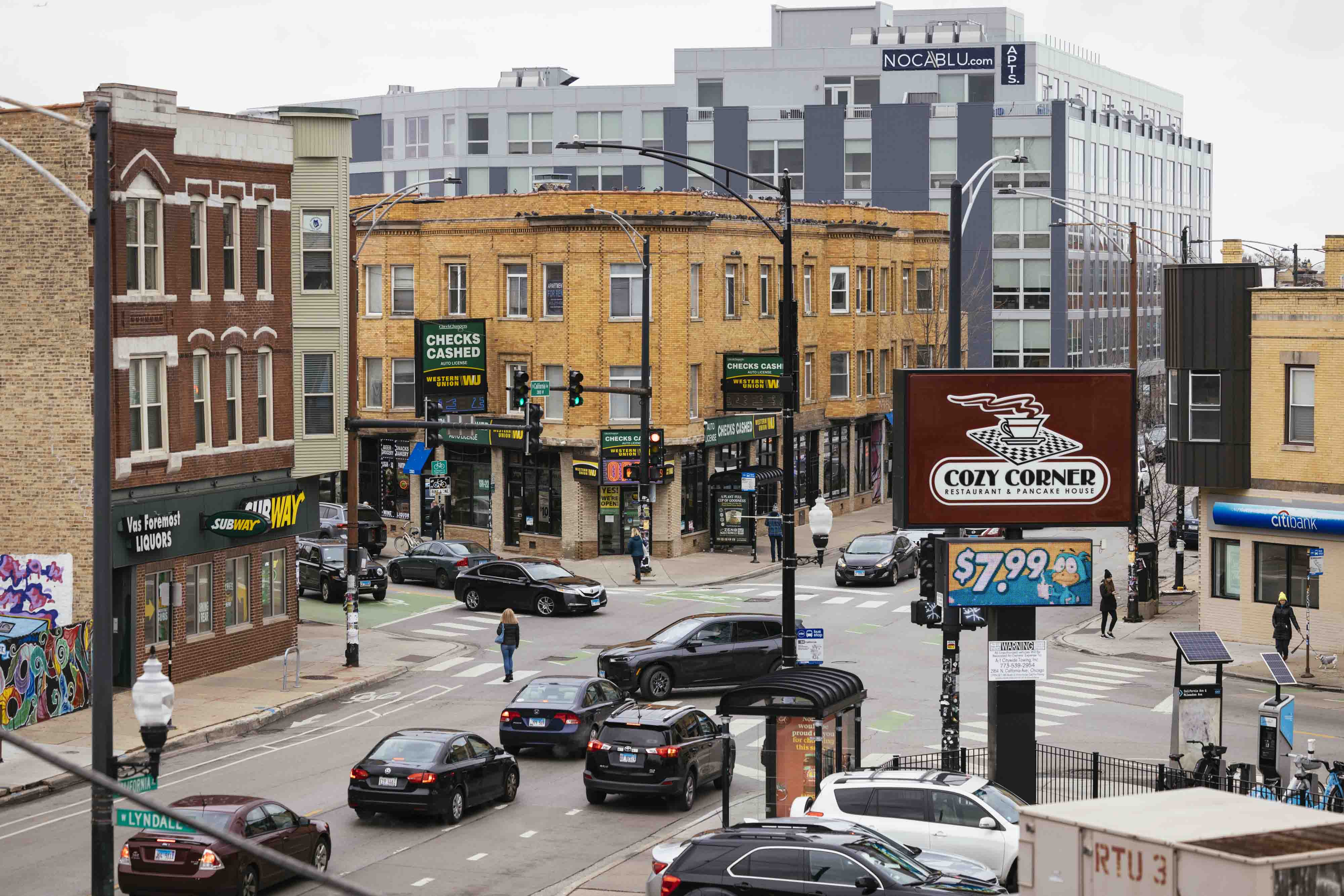 芝加哥洛根广场社区的加利福尼亚大道和密尔沃基大道交汇处,新公寓与老建筑交错在一起。