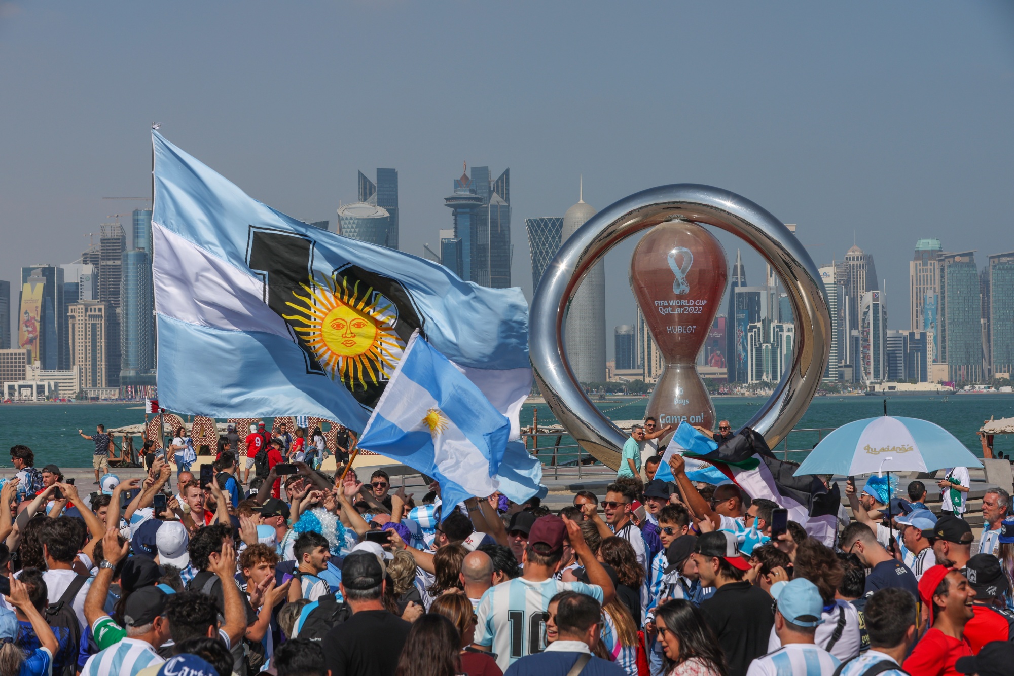 阿根廷国家足球队球迷聚集在多哈科尼奇(Doha Corniche)。摄影师:Christopher Pike/Bloomberg在有超过70万球迷涌入多哈的一个月之后,卡塔尔将重新变得相对空旷。球迷们已经开始返回家园,大量的移民工人也将离开。房地产经纪人担心公寓将无法完工,而酒店将有大量空房,一些体育场将永远不再被使用。