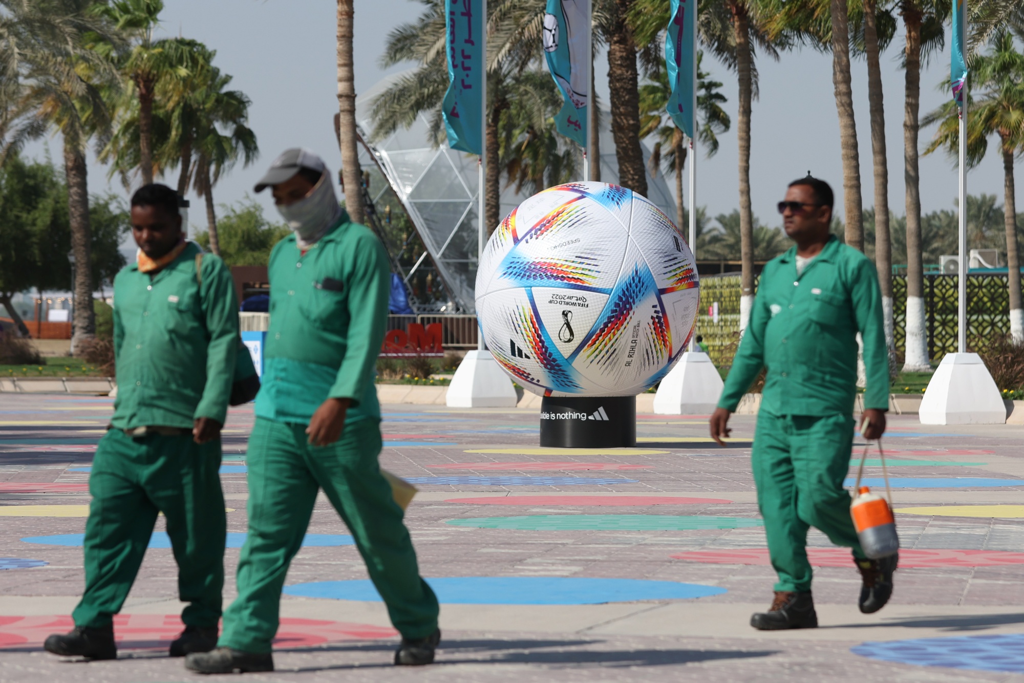 工人们经过阿迪达斯官方FIFA世界杯2022“阿尔里拉”足球的模型。摄影师:克里斯托弗·派克/彭博社“比赛结束不应意味着审查的结束,”伦敦商业与人权资源中心海湾项目经理伊索贝尔·阿彻说。 “尽管国际足球联合会和卡塔尔政府一再强调劳工改革是最终目标,但我们知道从工人们自己那里,实施仍然严重不足。”