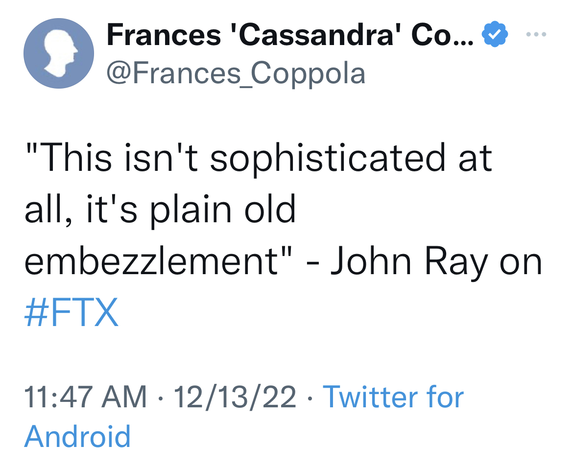 来源: @Frances_Coppola](https://twitter.com/Frances_Coppola/status/1602706881142837254)FTX的新老板约翰·J·雷三世(John J. Ray III)在一天前出现在国会面前,提供了他对失败的加密交易所究竟出了什么问题的观点。在听证会前一晚,班克曼-弗里德(Bankman-Fried)在巴哈马被捕,因此无法陈述他的事件版本。