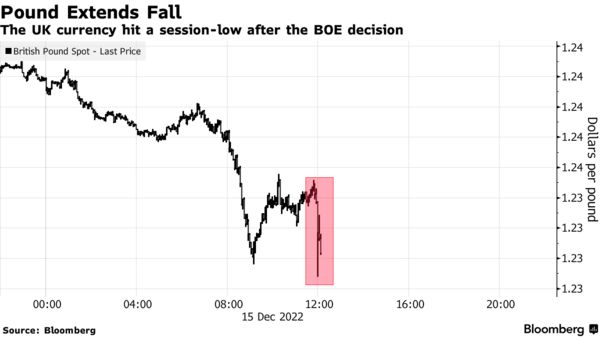 英镑持续下跌,英国政府债券在英国央行放缓货币紧缩步伐后出现反弹,投资者将此视为利率最终可能达到低于预期水平的迹象。英镑兑美元下跌超过1%,跌至1.23美元以下。