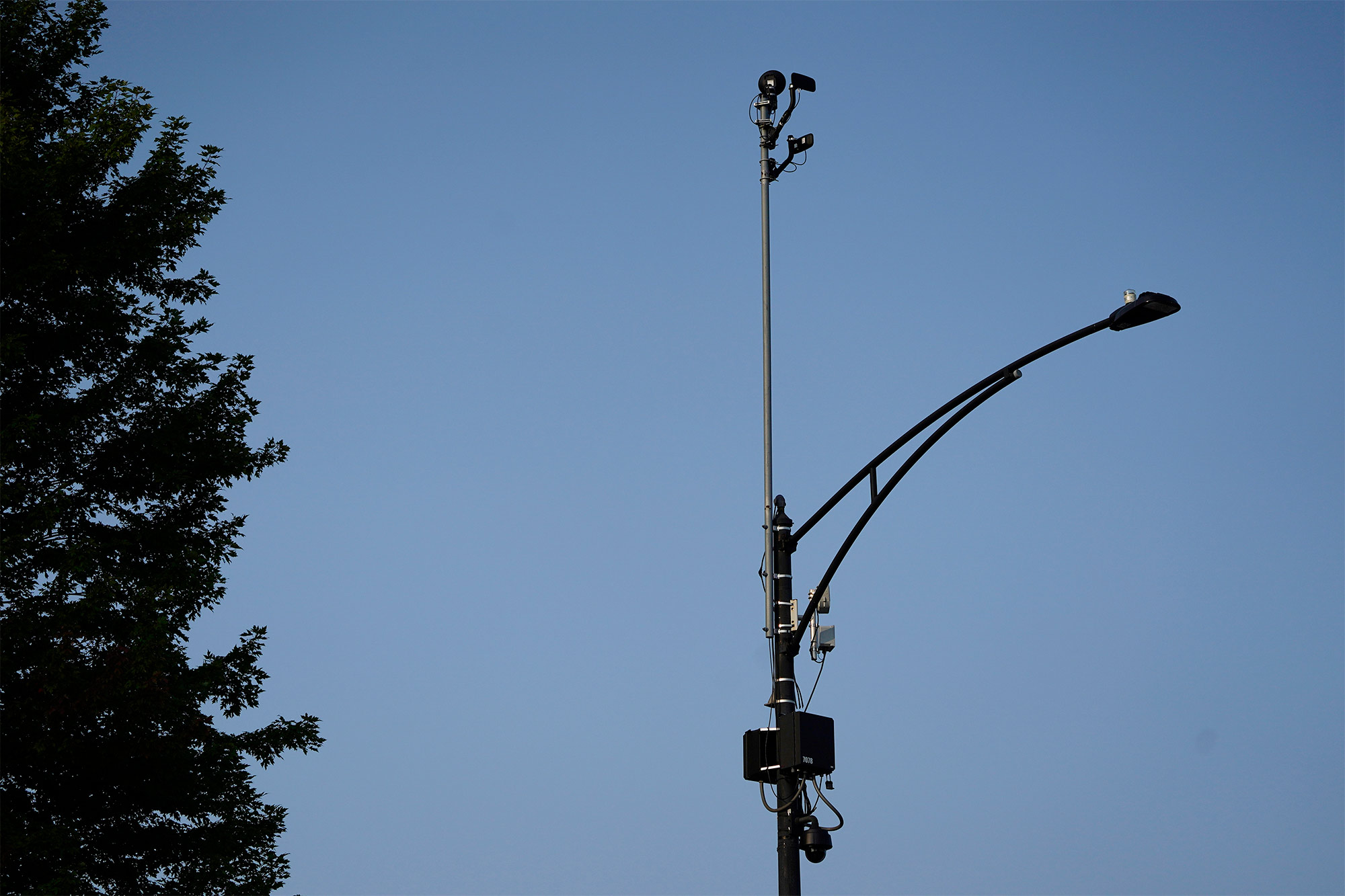 芝加哥一个十字路口上方的ShotSpotter设备。摄影师:查尔斯·雷克斯·阿博加斯特/AP### 音频作为证据