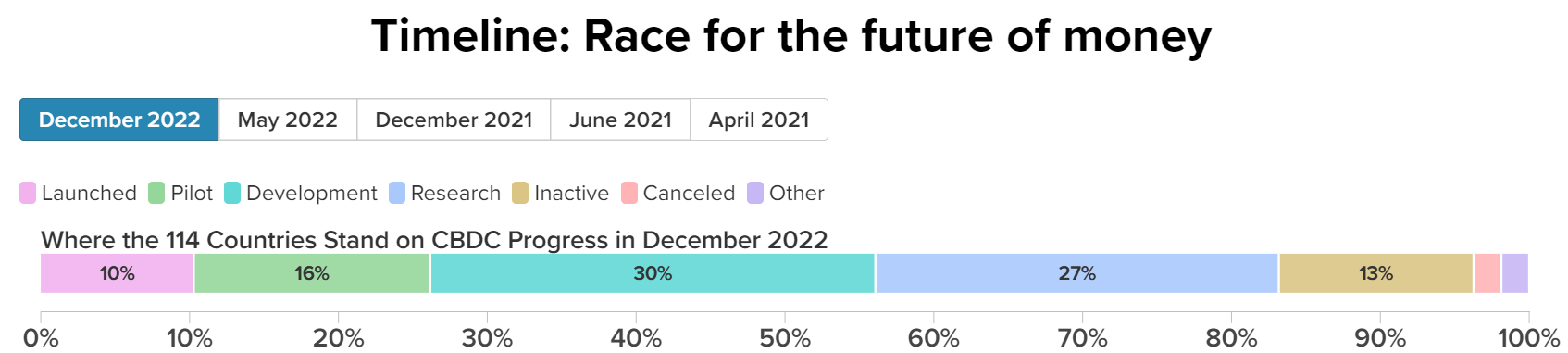 - 60个国家目前处于“探索的高级阶段”(意味着正在推出、试点或开发数字货币)