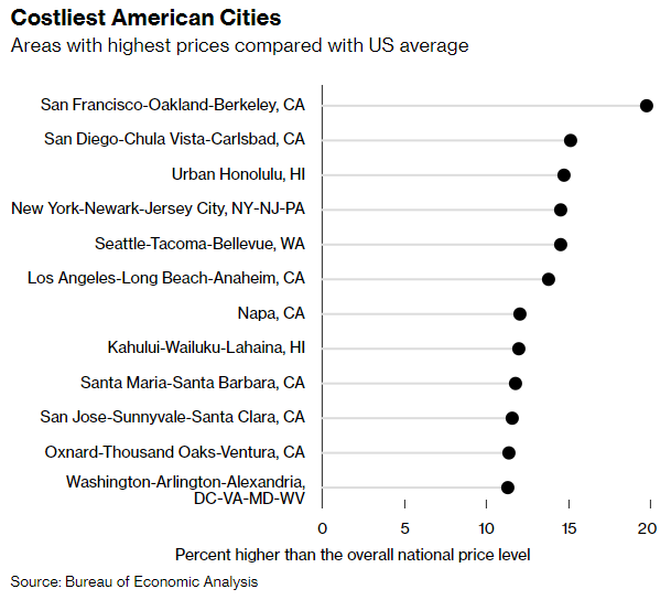 彭博社总体排名没有太大变化,旧金山再次摘得美国最昂贵都会区的可怜桂冠,自2018年以来一直如此。加利福尼亚州还有其他六个地区跻身前十二名,使加利福尼亚州与夏威夷和纽约一样成为最昂贵的州之一。