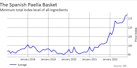 *西班牙人特别喜欢在周四吃的传统菜肴——西班牙海鲜饭,*由于大米和虾等海鲜价格飙升,准备这道菜的成本也在上涨。彭博社的新月度西班牙海鲜饭指数显示,这顿饭的食材成本比一年前高出15.2%。过去12个月,大米的价格上涨了15.3%,蔬菜的价格上涨了14.6%,导致这一指数激增,该指数汇总了西班牙国家统计局的数据。