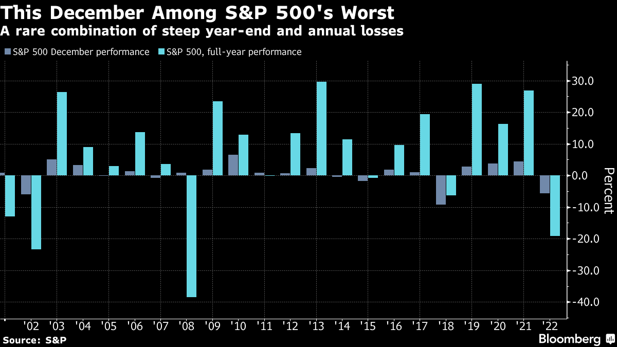 今年对股市来说是一个残酷的一年,而且看起来斯克鲁奇的精神也对节日的反弹说“巴哈,骗局!”尽管通胀放缓和美联储加息幅度较小,但标普500指数正朝着一个罕见的12月大跌走去。该指数本月下跌了5.6%,这将是本世纪第三大年末下跌,也是22次中的第六次下跌。