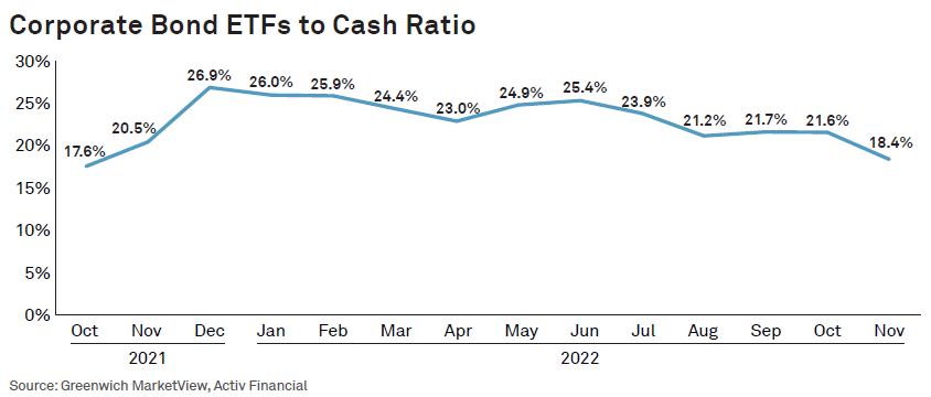 根据Coalition Greenwich的一份报告,信贷ETF的交易量在第四季度“回到了地球上”。企业债券ETF的名义交易量在11月份占总交易活动的约18%,是自2021年10月以来相对现金市场最慢的月份,远低于2022年26%的峰值,数据显示。