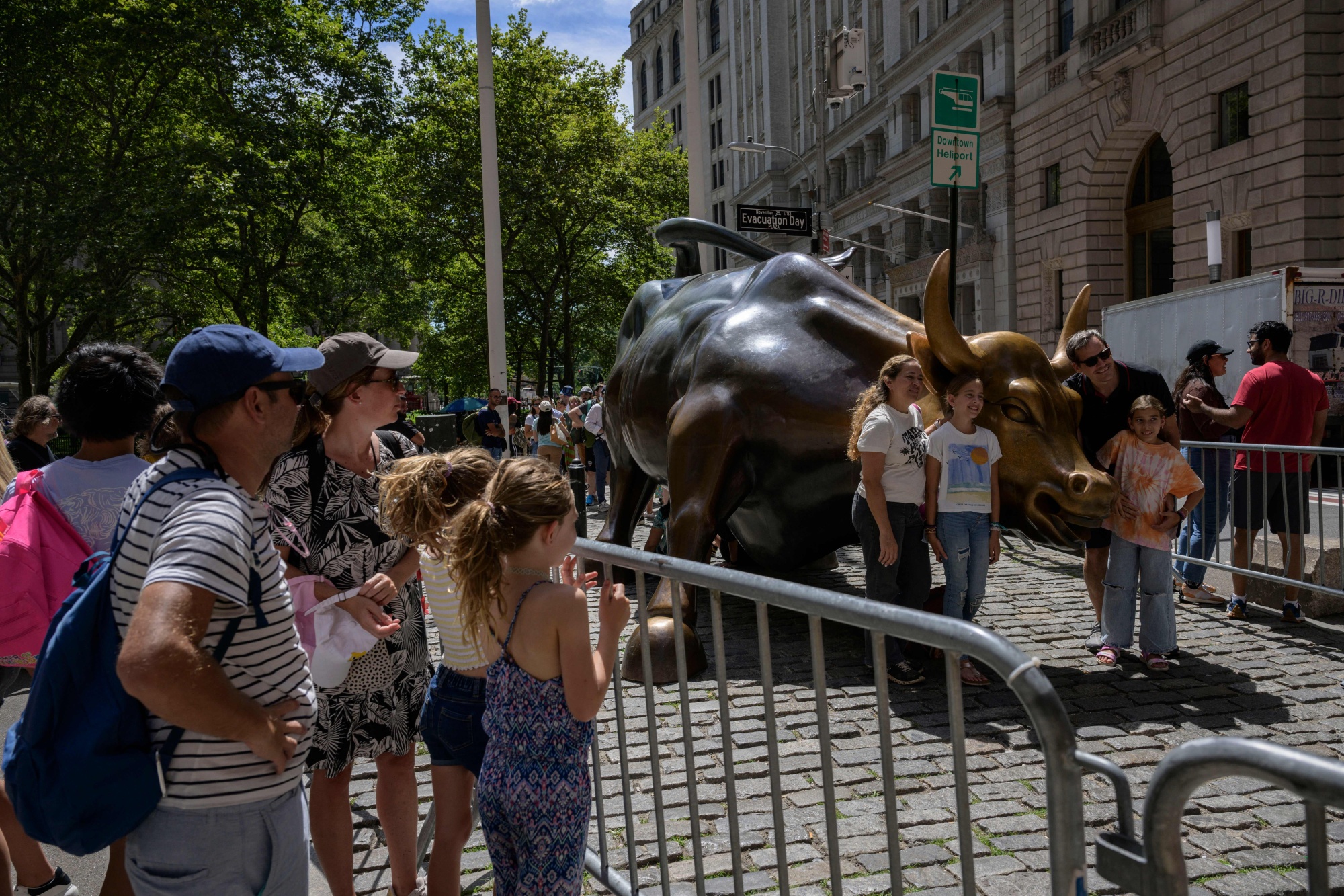 游客在8月16日在纽约与“奔牛”雕像合影。摄影师:安吉拉·韦斯/法新社/盖蒂图片社迪奥普的职业生涯展示了潜在的风险。他在疫情期间帮助推动上市的两家主要抵押贷款公司股价下跌超过50%,受到较高利率和经济担忧的打击。