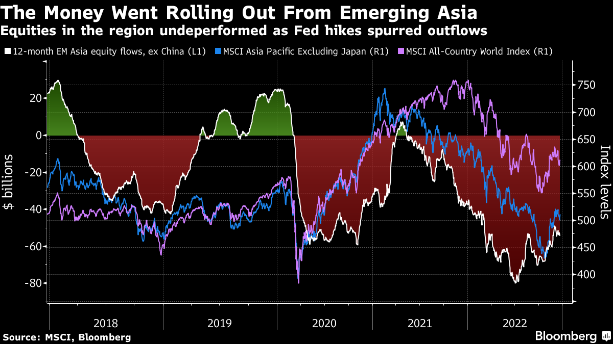2022年突显出的一个主题是,随着美联储迅速加息,许多新兴市场资产不断遭受抛售,推动美元大幅上涨。这导致该地区的股票在过去18个月左右的时间里下跌幅度比全球范围内看到的要大。