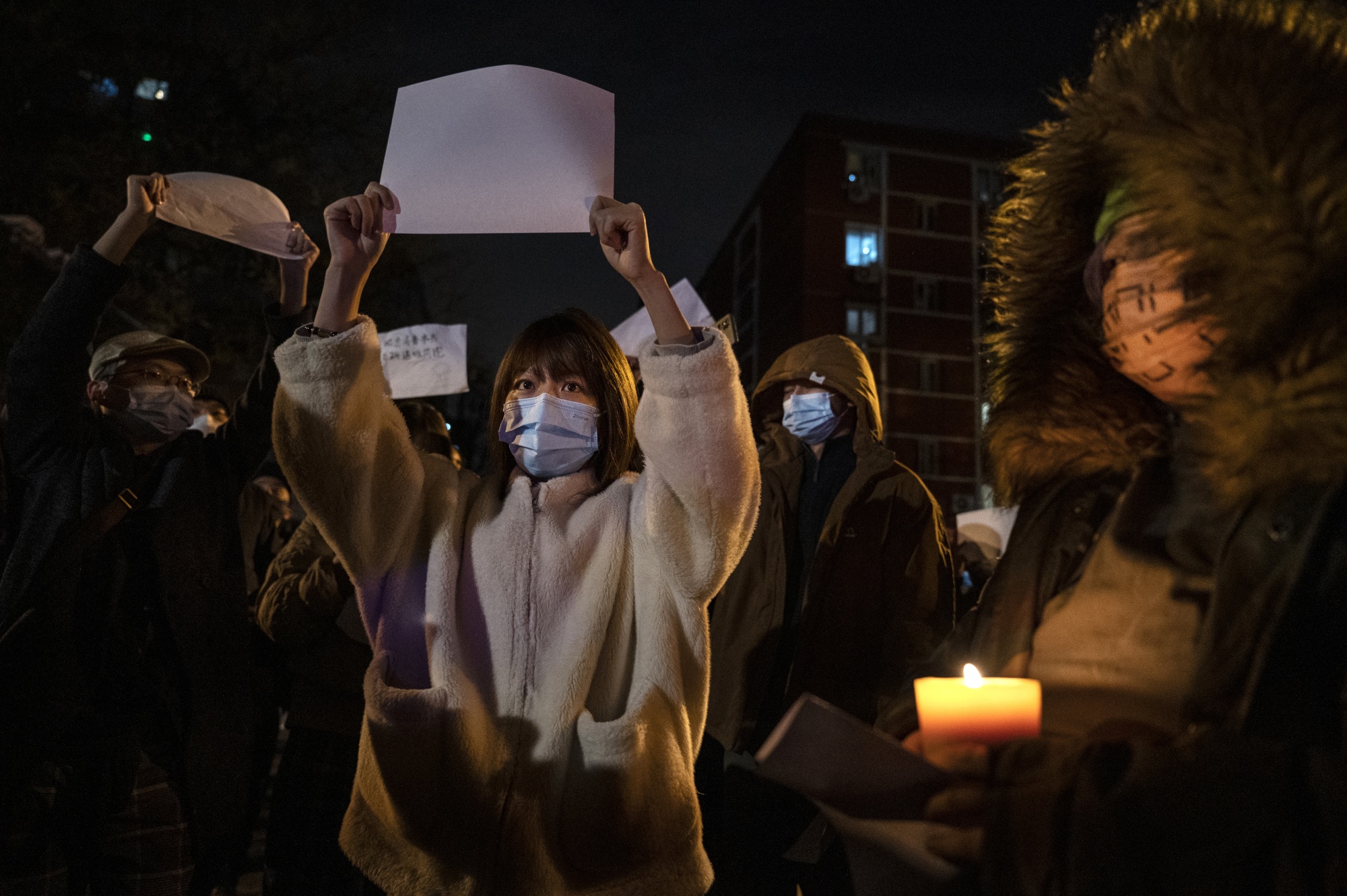 抗议者在北京抗议零COVID措施期间举起一张白纸。
