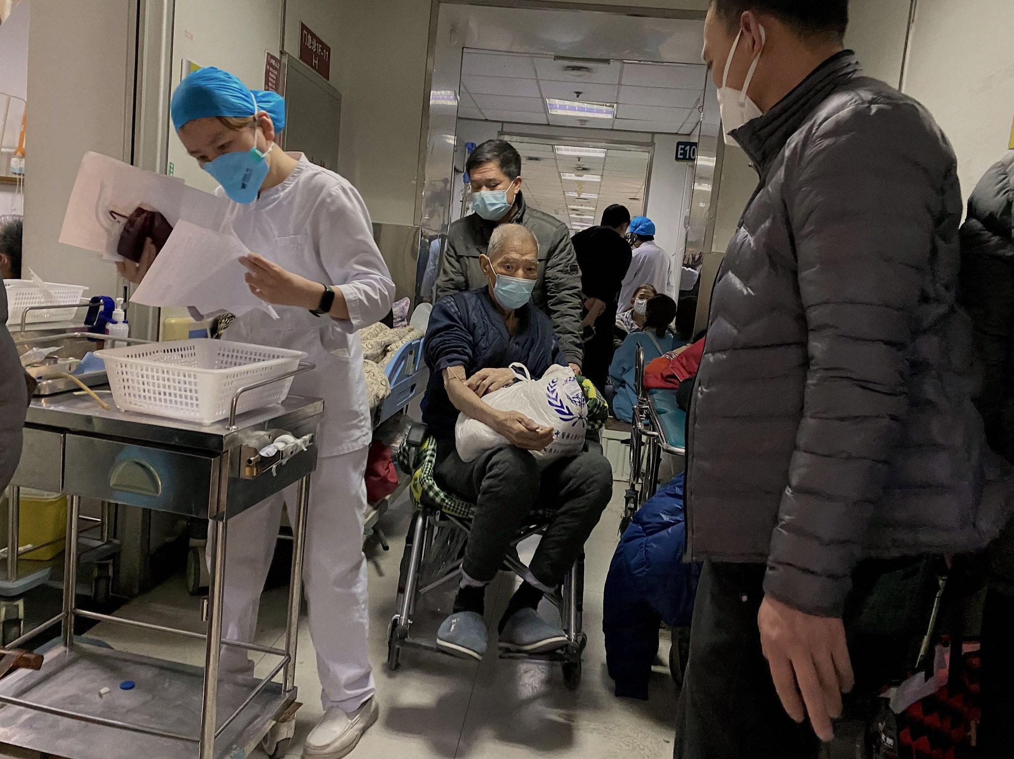 一名新冠肺炎患者被推着轮椅在中国天津第一中心医院转移。中国各个城市在习近平突然取消“零疫”封锁和检测制度后,都面临着感染激增、药品短缺以及医院和火葬场超负荷的困境。