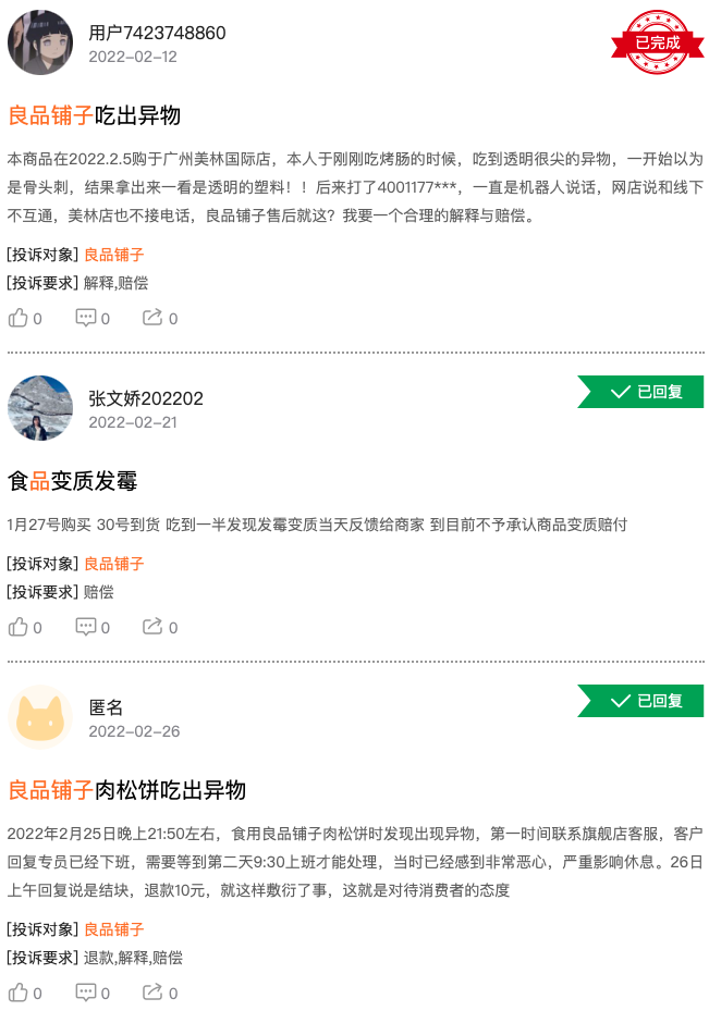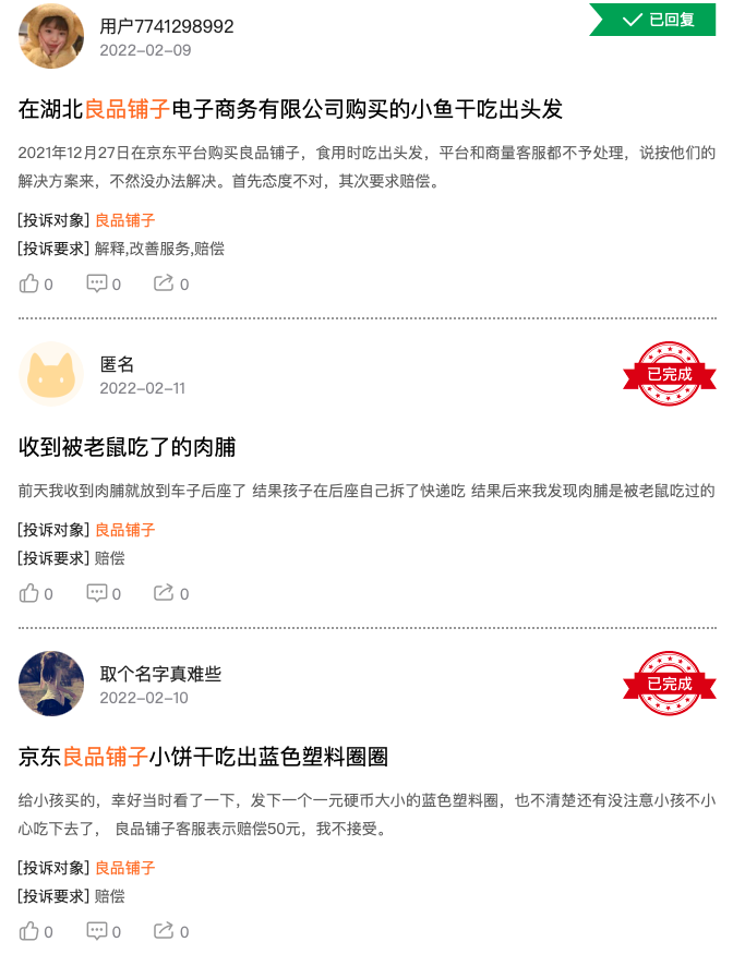 黑猫投诉上,截至目前有关良品铺子的投诉量已有近千条,其中,食品质量卫生类问题成为投诉重灾区。比如近期几条投诉分别为:在良品铺子烤肠中吃到透明塑料、食品变质发霉、肉松饼吃出异物、小鱼干吃出头发、肉脯被老鼠吃过、巴旦木吃出恶心虫子等。
