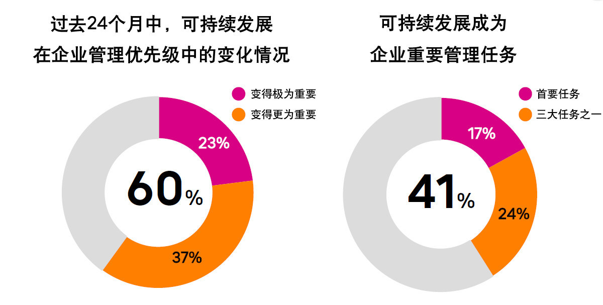 根据富士通在今年2月展开的一项调查数据显示*[1],可持续发展开始越来越多地引起企业高层决策者的注意。与两年前相比,60%的受访者表示,可持续发展在企业管理目标中的优先级不断提高;41%的受访者告诉富士通,可持续发展是他们的三大管理任务之一;对六分之一的企业来说,实现可持续发展已经成为他们的首要任务。