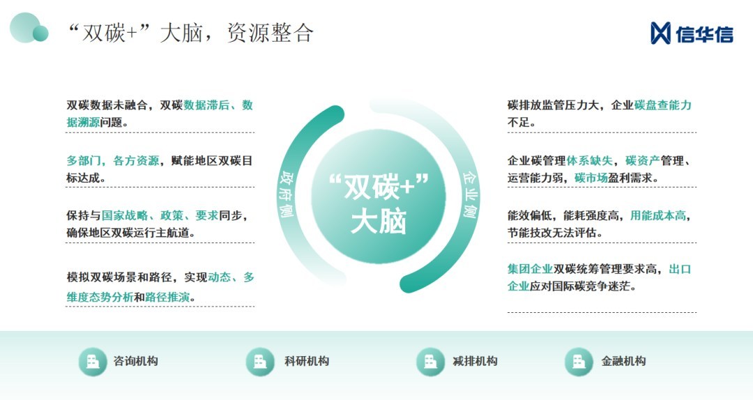 作为科技创新和行业赋能的践行者,信华信始终以成为世界一流的双碳咨询+数字化综合解决方案提供商为企业愿景。致力于以数字化技术,为政府提供双碳决策及监管、为企业提供碳资产管理、为园区提供低碳化服务、为行业提供碳应用,为社会绿色普惠体系建设提供数字化支撑。在节能减排、碳足迹、碳普惠、碳关税等细分领域,打造数字化双碳一站式服务。以践行科技企业社会责任为使命,助力政府及企业共探数智时代下的减碳新路径,为实现碳中和终极目标提供数字化支撑。