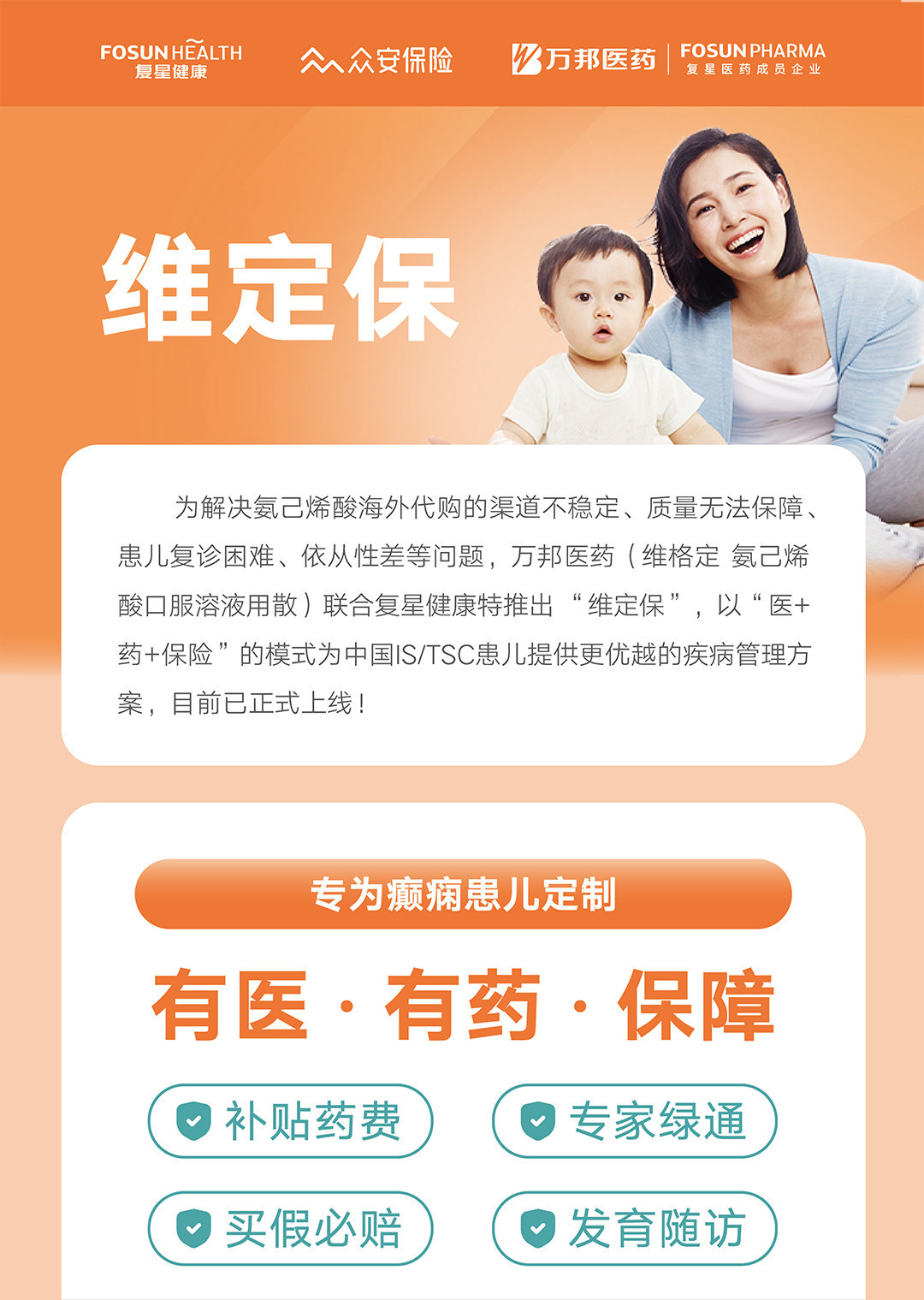 为满足上述的患者需求,在第16个"国际癫痫关爱日"来临之际,万邦医药联合复星健康推出的维格定®氨己烯酸口服溶液用散保险"维定保"正式上市,以"医+药+险"的模式为中国IESS/TSC患儿提供更全面的疾病管理方案。