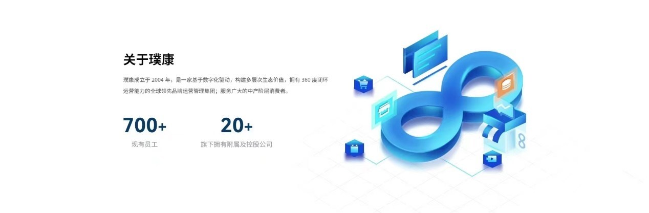 璞康成立于2004年,始终秉承"成就品牌价值"的使命,以坚实的资产矩阵和数字化管理能力为品牌提供全生命周期服务的同时,更可持续地与品牌产生价值共赢,实现全链条的主动价值创造。目前业务范围包括电商整合策略及运营服务、智慧零售、场域营销及运营解决方案、数字化整合营销平台、产品及IP孵化平台、基于大数据的私域社群建设及运营体系、数智化交付平台。