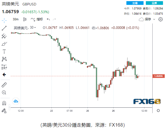 数据显示,英镑三个月隐含期权波动率周一触及19.785%的日内高点,为2016年6月底英国脱欧公投结果以来的最高水平,当时波动率超过22%。今天早些时候,英镑/美元一度跌超5%至1.03475的低点,这是自20世纪70年代初该货币对跌落至2.00下方以来的最低水平。目前英镑/美元已经回升至1.0676左右,为多年来波动最大的交易日之一。