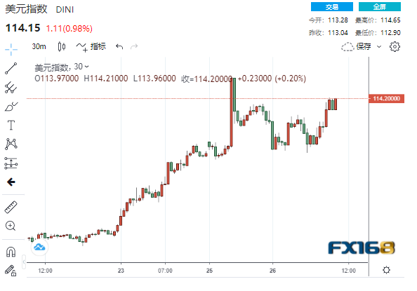 在英国当局推出包括新支出和减税在内的新刺激方案后,英镑大幅下挫,美元大幅走高。日内,美元指数最高触及114.65,现回落至114.15一线交投。