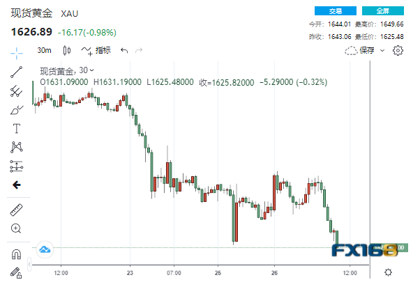 美市盘中,现货黄金下跌约1%至1626.48美元低点,为2020年4月以来的最低水平。